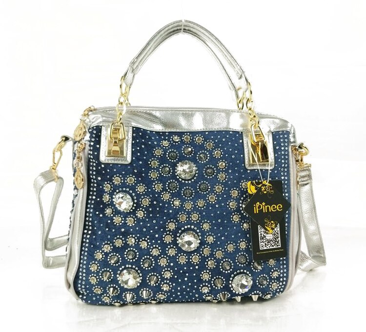 iPinee Ladies Handbags Women Fashion Bags Brand Design Women’ Shoulder Bags Denim Rhinestones Decorative