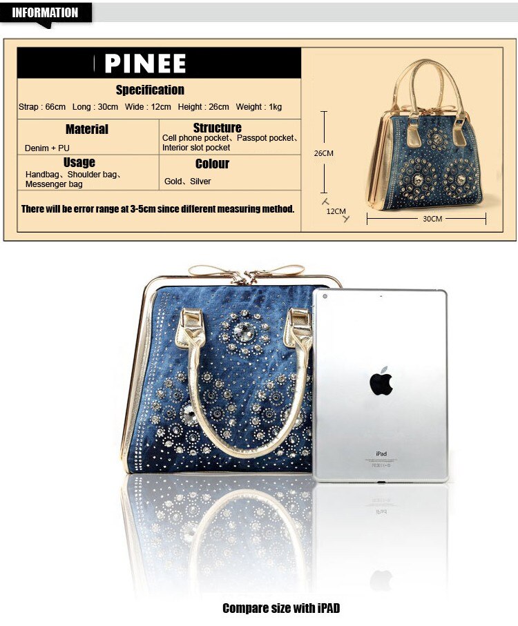 iPinee fashion women handbags designer diamond decoration denim tote bags luxury ladies vintage bag
