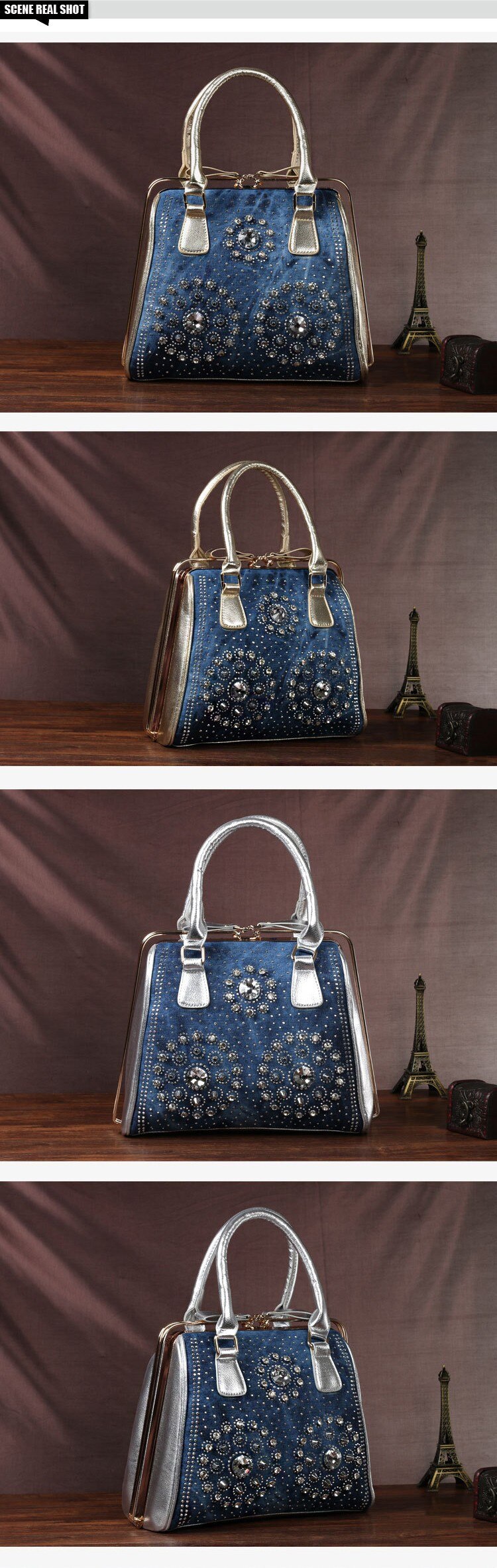 Home Rhinestone Denim bags iPinee fashion women handbags designer diamond decoration denim tote bags luxury ladies vintage bag