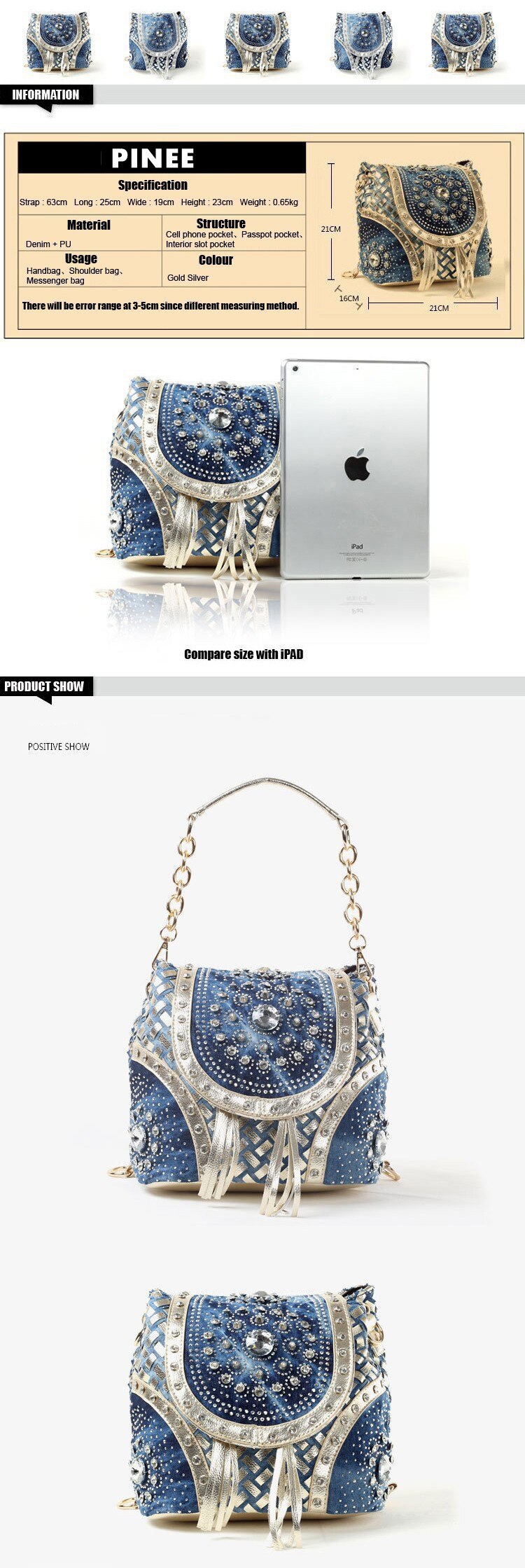 iPinee fashion women handbags designer diamond decoration denim tote bags luxury ladies vintage bag
