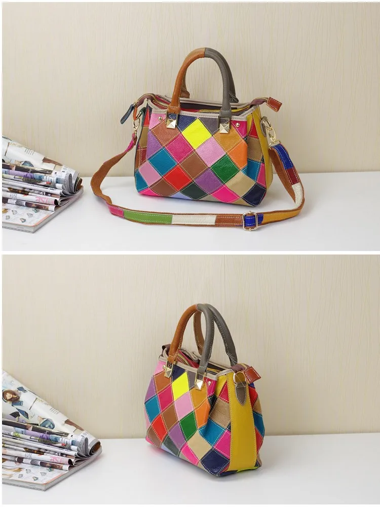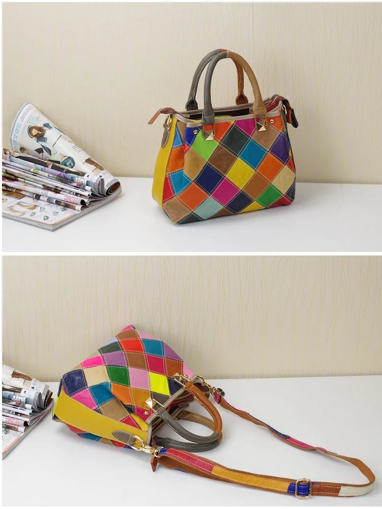 Please Notice: Handbag spliced by random colorful leather blocks, each one are different.
