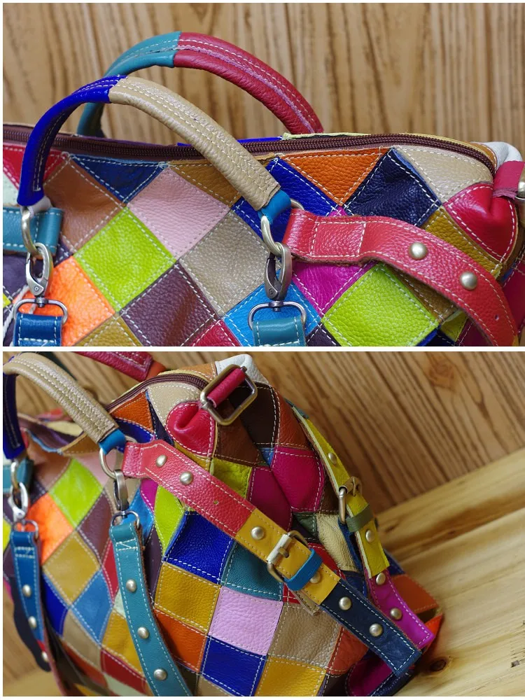 Please Notice: Handbag spliced by random colorful leather blocks, each one are different.