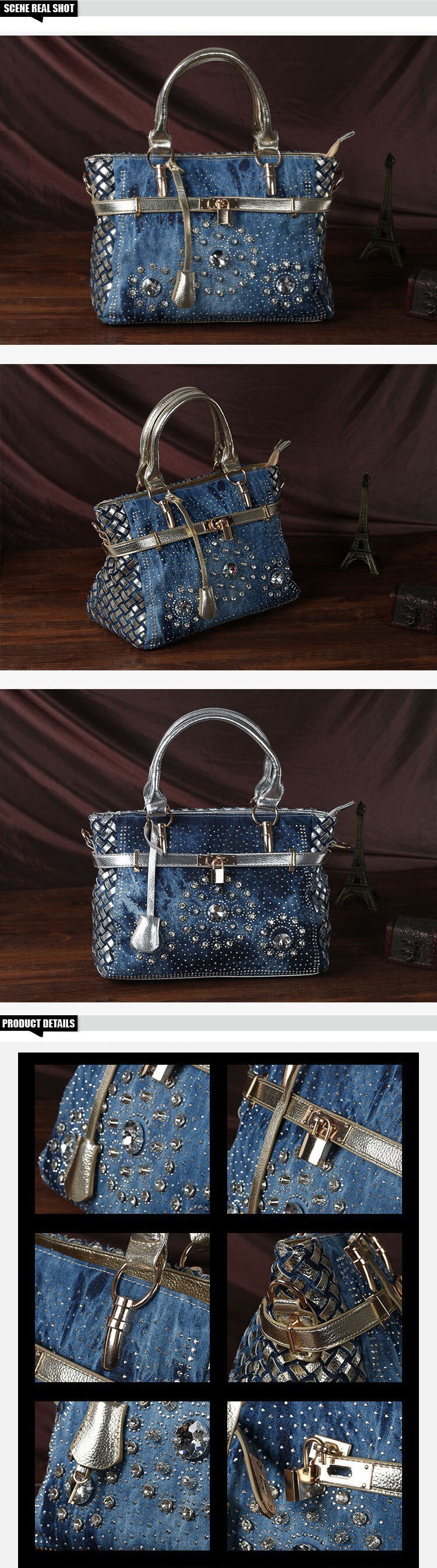 iPinee fashion women handbags designer diamond decoration denim tote bags luxury ladies vintage bag
