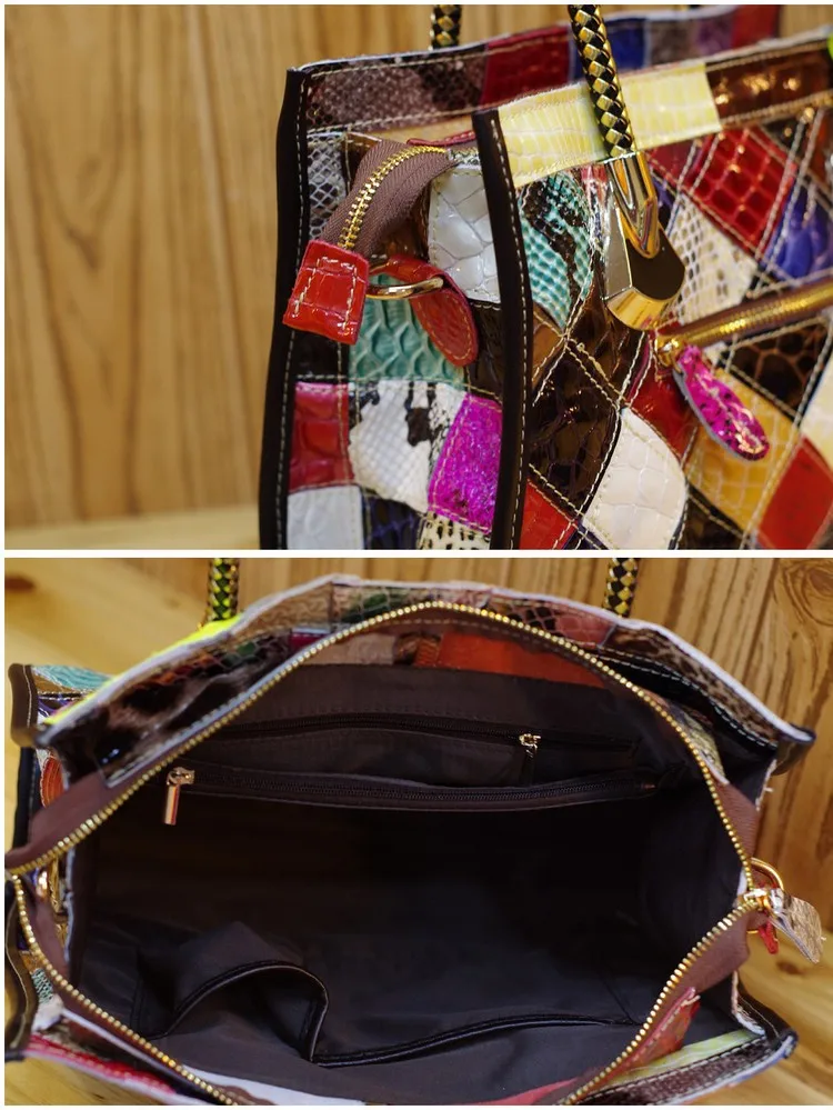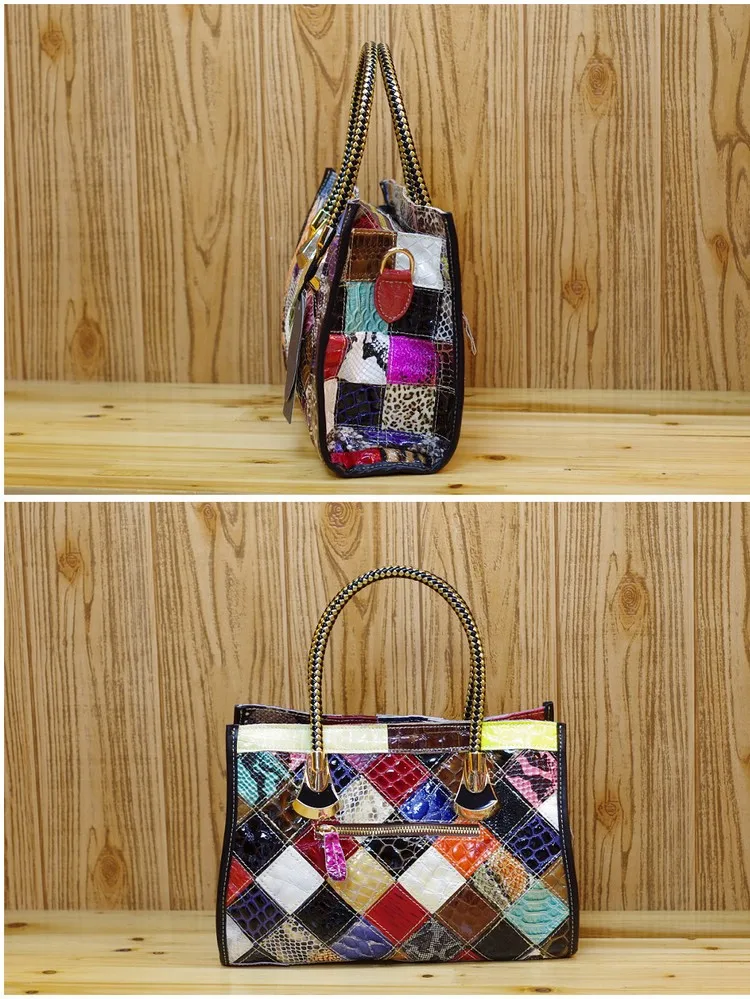 Women Cowhide Leather Snake Pattern 100% REAL LEATHER Handmade Patchwork Women Shoulder Bags Shiny Color Block