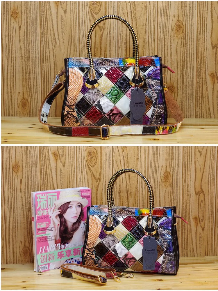 Please Notice: Handbag spliced by random colorful leather blocks, each one are different.