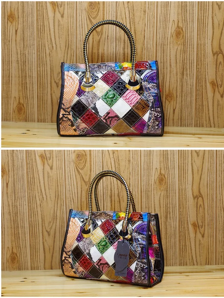 Home Colored Cowhide Bags iPinee Women Cowhide Leather Snake Pattern 100% REAL LEATHER Handmade Patchwork Women Shoulder Bags Shiny Color Block